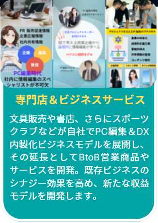 士業などが新たなクライアントを獲得するための具体例として、デジタルマーケティングの活用が挙げられます。飲食経営に関わる手続きを行う行政書士であれば、インターネットを使った集客と営業モデルを併せて提案するなど、専門分野の仕事を開拓するためには、営業先の事業モデルの提案が必須の時代です。専門サービスを生かした提案に伴う付加サービスとして、PC編集&DX内製化とプロジェクト支援モデルを提供します。